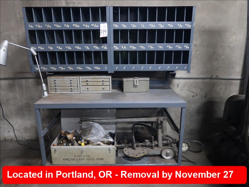 LOT, STEEL TABLE W/PARTS BINS & CONTENTS