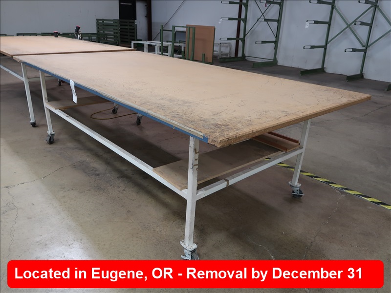 APPROX 61"W X 121"L STEEL FRAMED WOOD TOP TABLE W/POWER PLUG