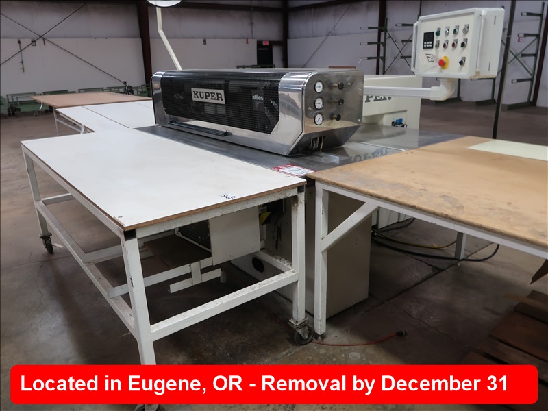 ZIG ZAG VENEER SPLICING MACHINE W/DROP TABLE, 1,250MM THROAT, APPROX 15-60M/MIN FEED SPEEDS, APPROX 0.3-3.0MM VENEER THICKNESS, 460V, R200 SWING ARM TOUCH CONTROLS, PNEUMATIC CONTROLS ON GLUE HEAD, PRESSURE CONTROLS & AC UNIT ON MARKED TABLE