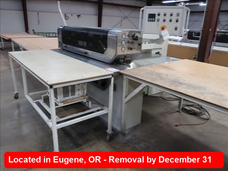 ZIG ZAG VENEER SPLICING MACHINE, 1,250MM THROAT, APPROX 15-60M/MIN FEED SPEEDS, APPROX 0.3-3.0MM VENEER THICKNESS, 460V, R200 SWING ARM TOUCH CONTROLS, PNEUMATIC CONTROLS ON GLUE HEAD, PRESSURE CONTROLS & AC UNIT ON MARKED TABLE