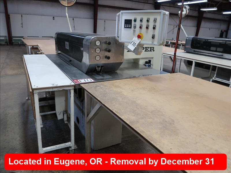 ZIG ZAG VENEER SPLICING MACHINE, 1,250MM THROAT, APPROX 15-60M/MIN FEED SPEEDS, APPROX 0.3-3.0MM VENEER THICKNESS, 460V, R200 SWING ARM TOUCH CONTROLS, PNEUMATIC CONTROLS ON GLUE HEAD, PRESSURE CONTROL & AC UNIT ON MARKED TABLE