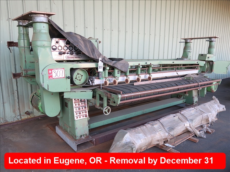 8' TWIN CROSS BELT SANDER W/2,550MM SANDING WIDTH, 18-1/2KW MOTORS & PNEUMATIC PRESSURE BEAM, FED BY PARALLEL CARPET STRIP BELTS W/VARIABLE SPEED, MOTORIZED HEIGHT ADJUSTMENT OF THE TABLE (NOT INSTALLED)