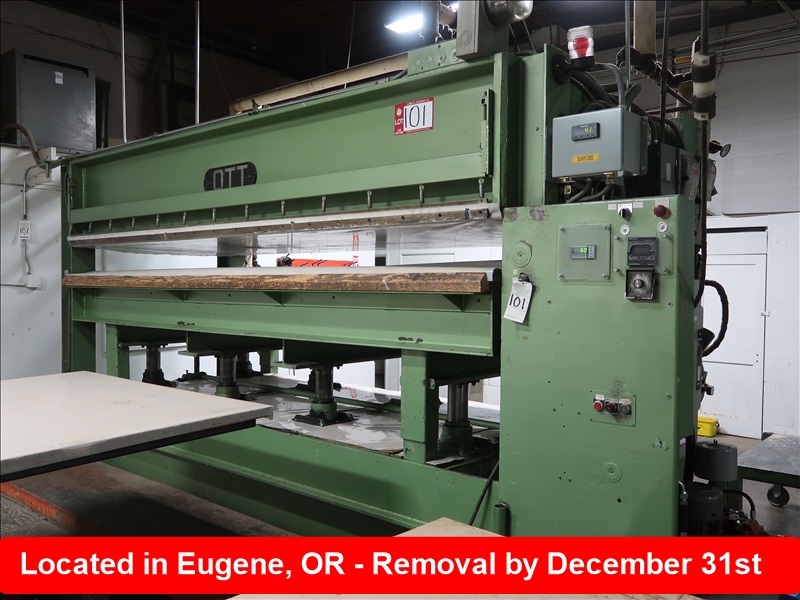 5' X 12' SINGLE OPENING HOT PRESS, (8) 4-1/2" RAMS, 2-COLUMN, APPROX 5 HP HYDRAULIC UNIT & PUMP, DIGITAL READOUT CONTROLS, ATTACHED ELECTRICS W/2011 HEAT EXCHANGE & TRANSFER CO CC12-248-483 HEAT EXCHANGER, S/N:11-8432-1A-150B, WOOD WALKWAYS (NO TRANSFORME