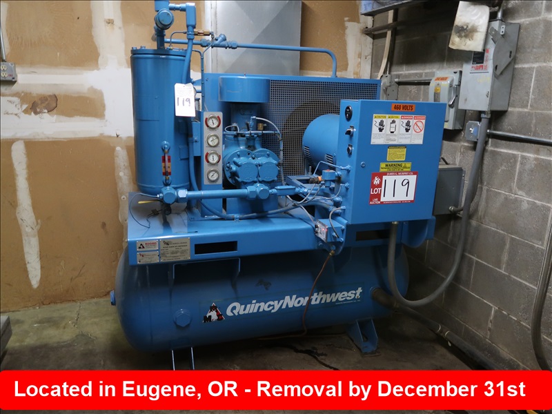 TANK MOUNTED ROTARY SCREW COMPRESSOR, 30 HP MOTOR, AIR COOLED, HRS:16,648, MARKED ELECTRICS, PIPING TO CEILING, SPARE COMPRESSOR OIL & FILTERS