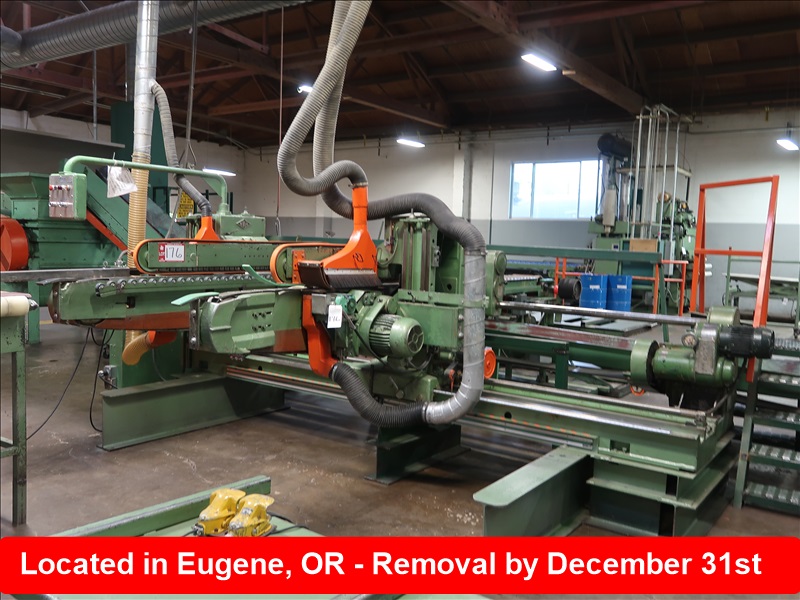 DOUBLE END TENONER, 10' CAPACITY, 4-HEAD W/APPROX 2 KW & 4 KW MOTORS, POWERED 5' FEED THRU CHAINS W/DEMAG GEARHEAD MOTOR, POWERED TRAVEL, 1 HP BLOWER (FLEX PIPING ONLY)