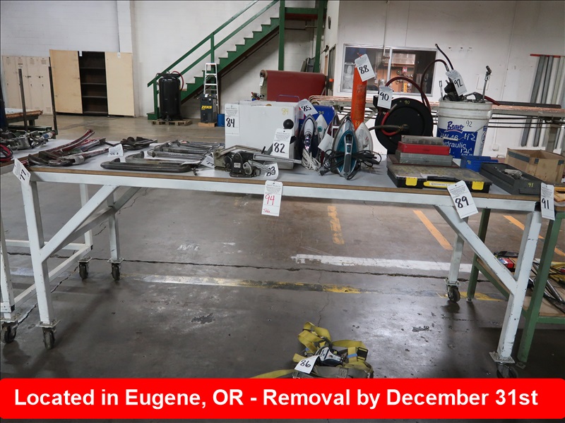 APPROX 36" X 97" STEEL FRAMED WOOD TOP TABLE ON CASTERS (MUST WAIT UNTIL EMPTY TO REMOVE)