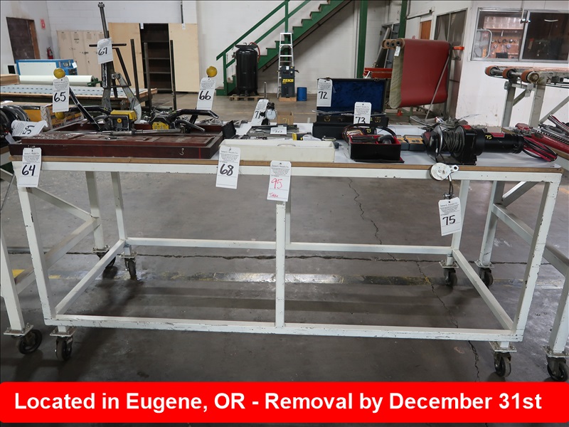 APPROX 36" X 97" STEEL FRAMED WOOD TOP TABLE ON CASTERS (MUST WAIT UNTIL EMPTY TO REMOVE)