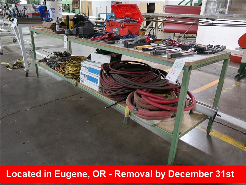 APPROX 30" X 120" STEEL FRAMED WOOD TOP TABLE ON CASTERS (MUST WAIT UNTIL EMPTY TO REMOVE)
