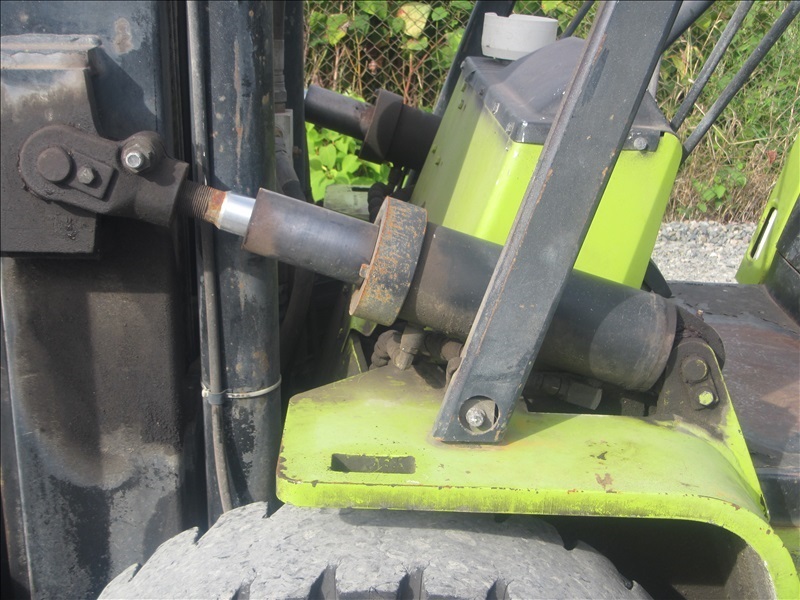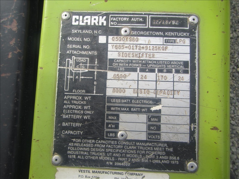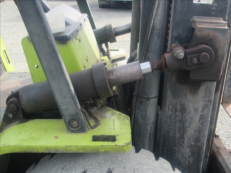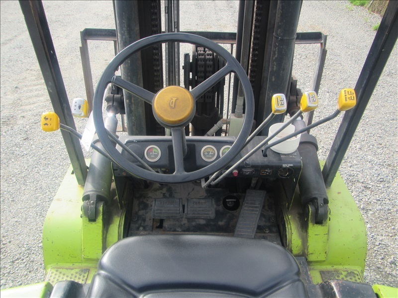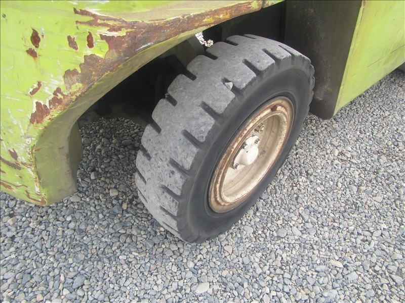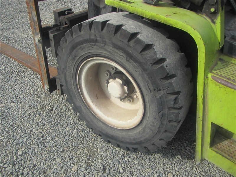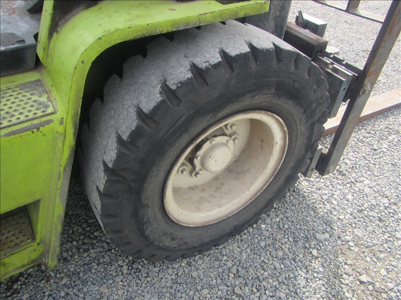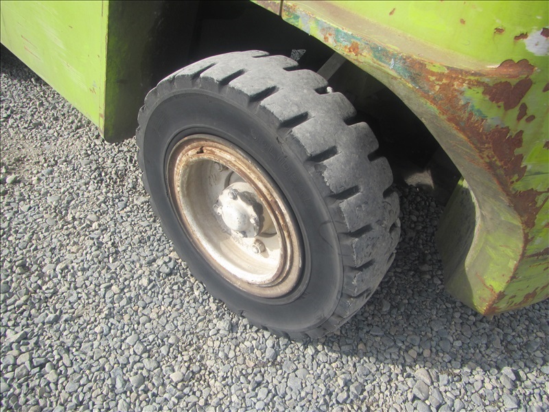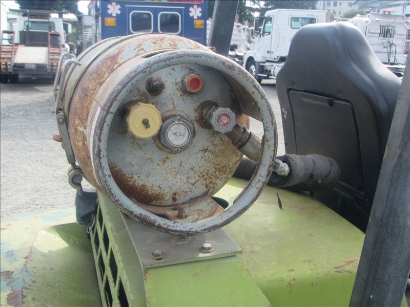8,000 LB SOLID CUSHION TIREFORKLIFT, 170" FORK HEIGHT,3-STAGE MAST, SIDE SHIFT,4 CYL PROPANEHOUR METER READS: 4,677