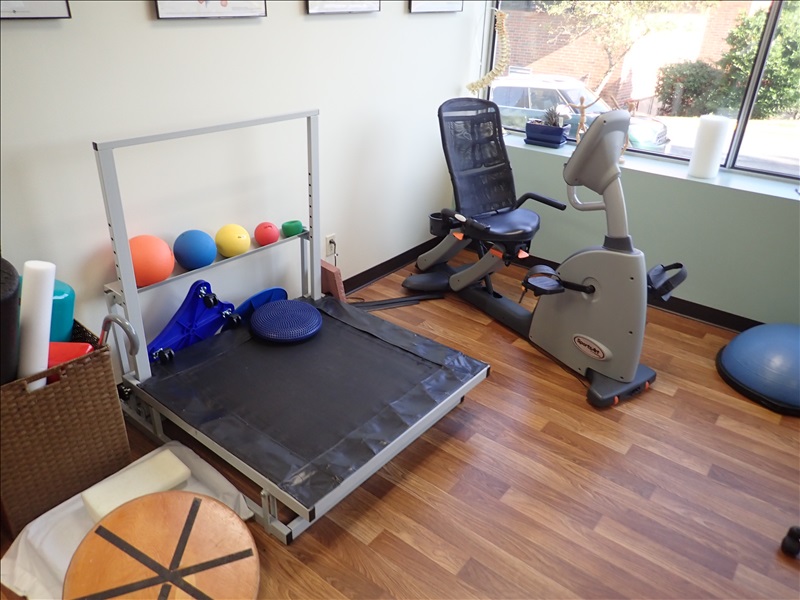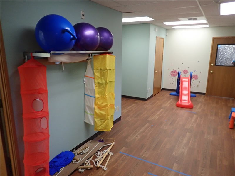 GYM AREA TO INCLUDE: FISHER PRICE SLIDE, (2) EXERCISE BALLS, (2) KIDS CHAIRS & ASSORTED THERAPY EQUIPMENT
