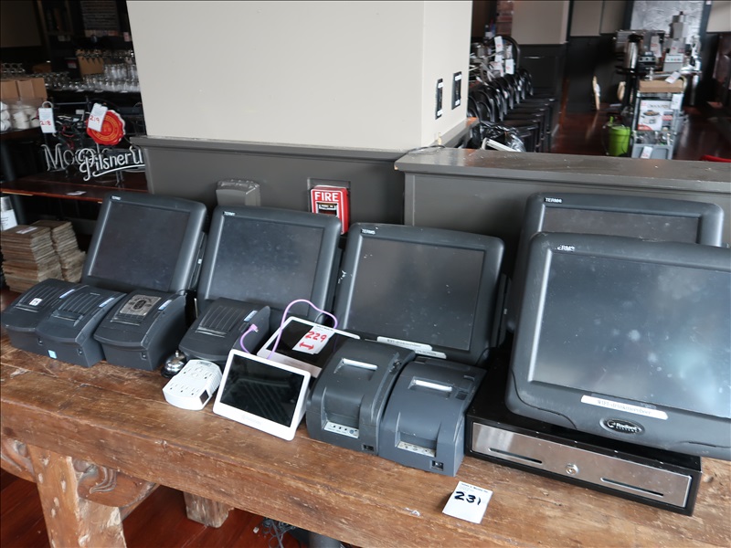 LOT, P.O.S. SYSTEM INCLUDING (5) RADIANT SYSTEM TOUCHSCREEN MONITORS, (6) SLIP PRINTERS, (1) CASH DRAWER & (2) TABLETS