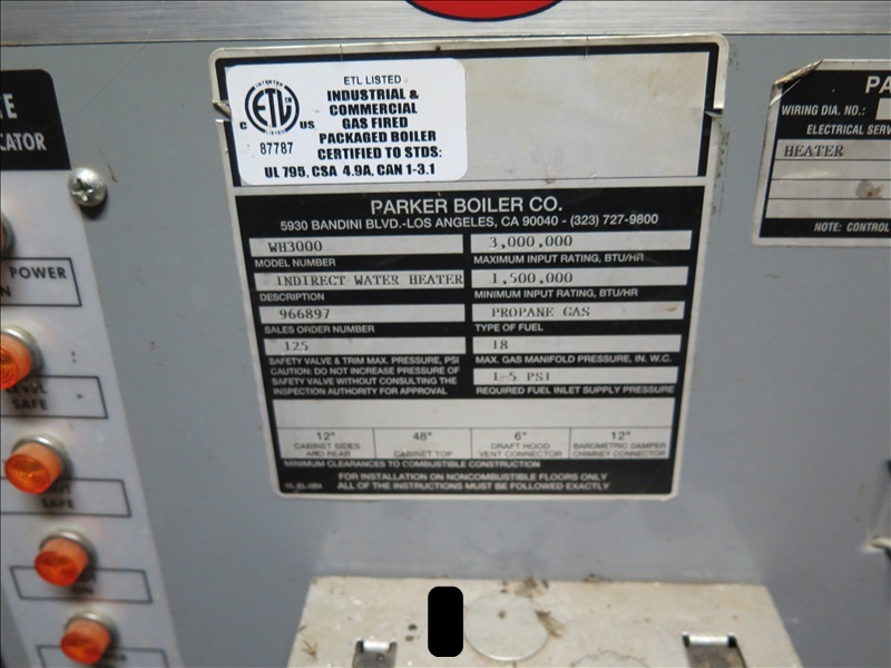3,000,000 BTU INDIRECT WATER HEATER, 125 PSI, PROPANE (GAS LINE BREAKS @ 1ST COUPLER, $250 REFUNDABLE DEPOSIT REQUIRED FOR GAS LINE CAP, POWER BREAKS @ SAFETY SWITCH, SAFETY SWITCH STAYS W/BUILDING, WATER BREAKS @ 1ST COUPLER)