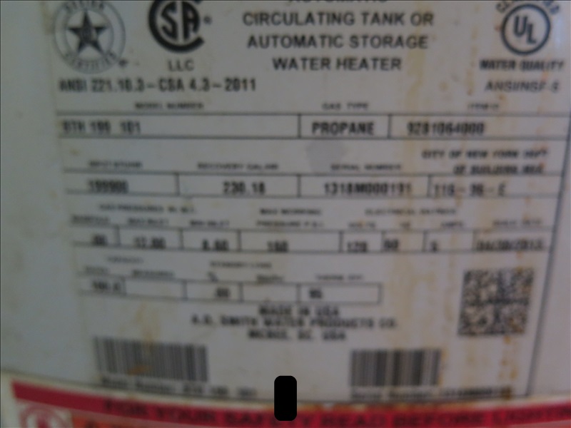 LOT, (4) AO SMITH BTH-199-01 CYCLONE XF, 230-GAL PROPANE WATER HEATERS (GAS LINES BREAK @ 1ST VALVE, $500 REFUNDABLE DEPOSIT FOR GAS LINE CAP, WATER LINE BREAKS @ 1ST COUPLER)
