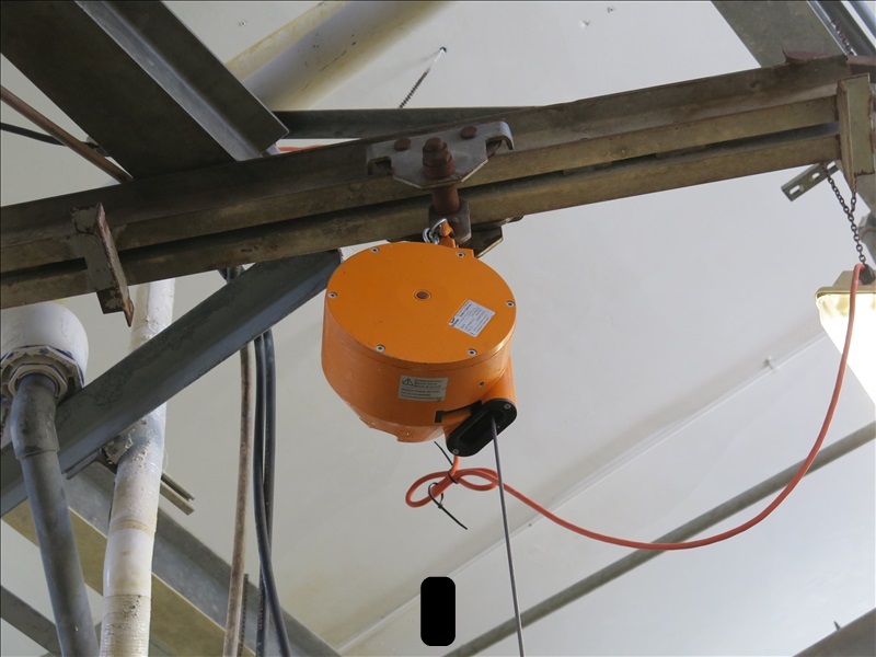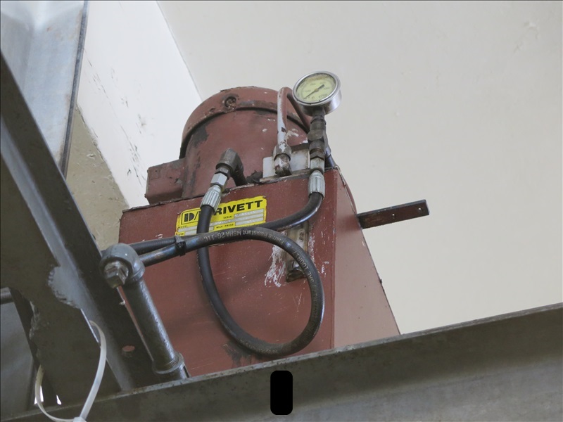 HYDRAULIC BRISKET SAW W/BALANCER & TROLLY, RIVETT HYDRAULIC PUMP W/HOSES FROM SAW TO PUMP (SUPPORT STRUCTURE STAYS WITH BUILDING)