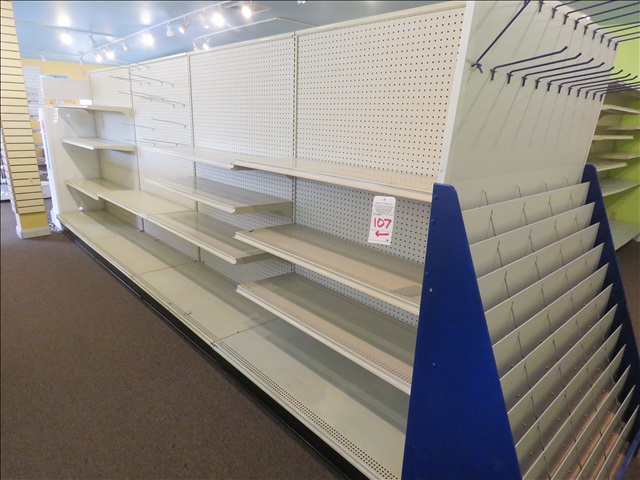 LOT, 18' DOUBLE SIDED METLAL SHELVING & END CAPS