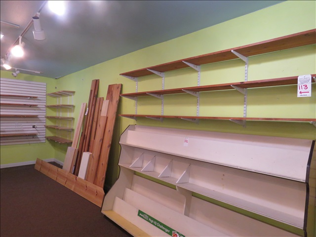 LOT, (3) WOOD SHELVES W/WALL BRACKETS & (4) 66" WOOD SHELVES & (5) 61-1/2" WOOD SHELVES, SLOT WALL & WALL BRACKETS