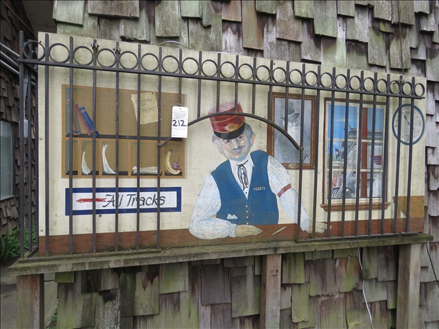 COUNTRY VILLAGE TICKET TAKER PAINTING ON BARN WOOD W/WROUGHT IRON WINDOW