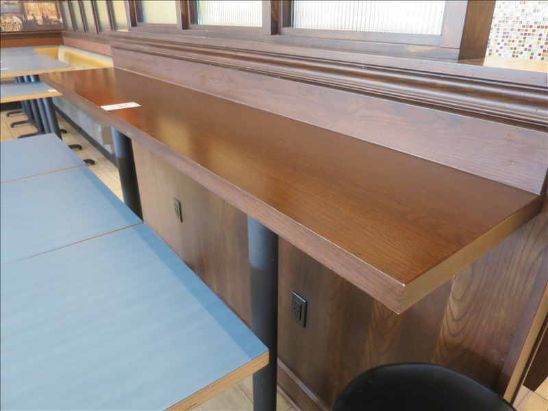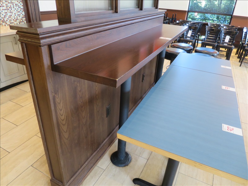 15" X 81-1/2" DOUBLE PEDESTAL BOLTED TO FLOOR WOOD TOP BAR (REQUIRES UNBOLTING FROM FLOOR MOUNTED BOLTS, BOLTS TO REMAIN IN FLOOR, ROOM DIVIDER IS NOT INCLUDED)