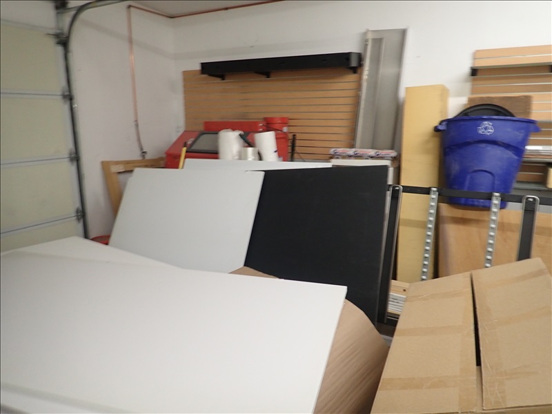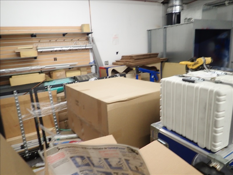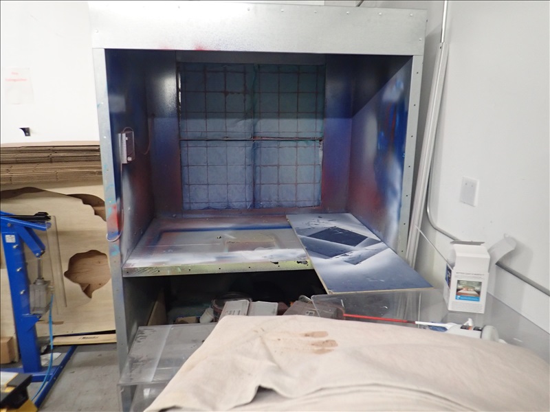 SMALL PAINT BOOTH, SANDBLASTER, PALLET JACK, DEWALT CHOP SAW, BENCH TOP BREAK, CARTS, BOX STAPLER & MISC. SHOP SUPPLIES