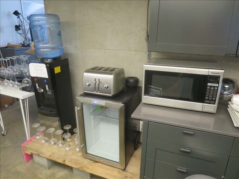 ASSORTMENT OF SMALL APPLIANCES TO INCLUDE GHP WATER COOLER, 17" GLASS DOOR COUNTEROP REFRIGERATOR, MICROWAVES, TOASTERS, KEURIG K-CUP COFFEE MAKERS
