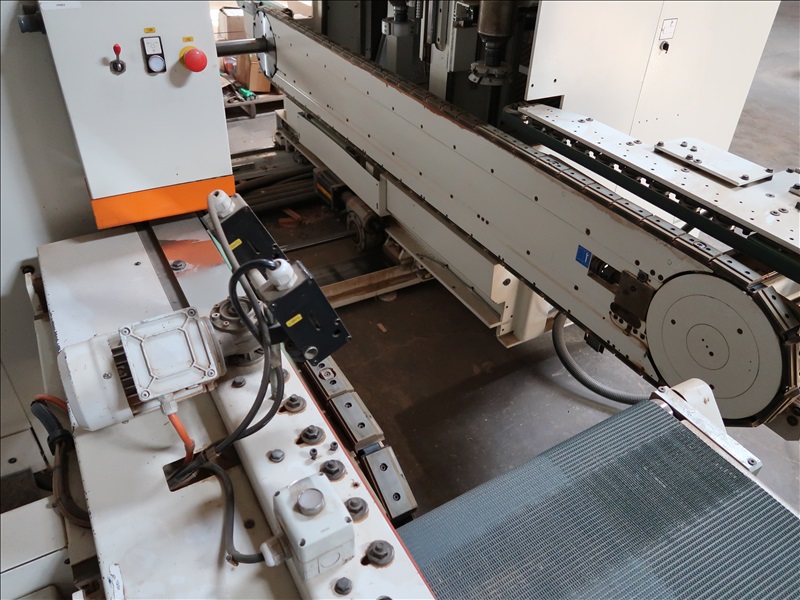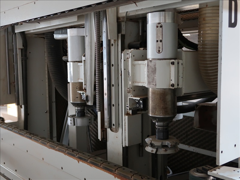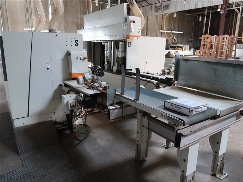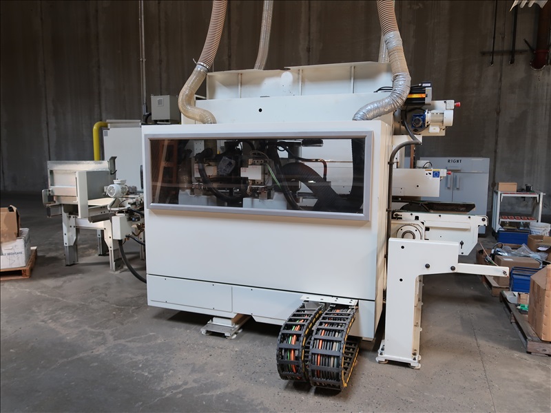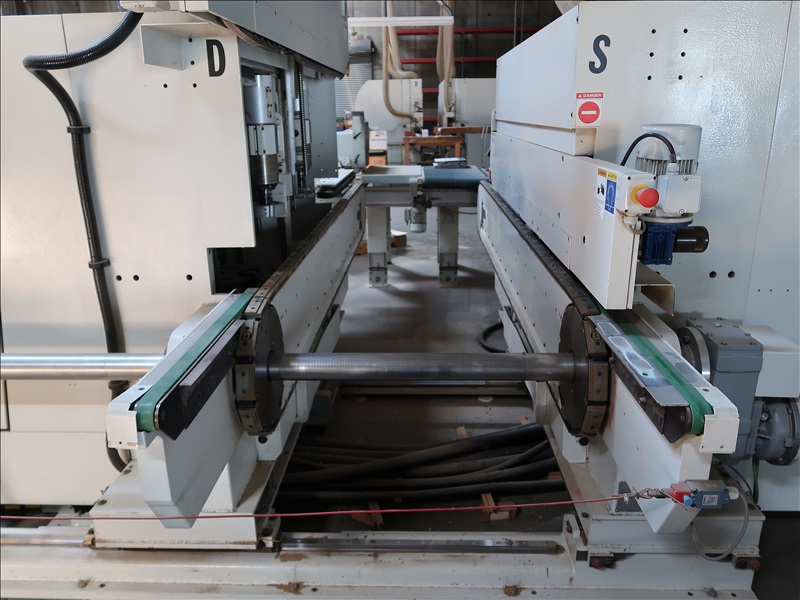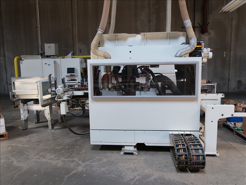 CNC DOUBLE END TENONER W/APPROX 1-1/2"X40" WIDTH & 3" THICKNESS CAPACITIES, VARIABLE SPEED INFEED BELT TO FEED THRU CHAINS W/POP UP BOARD DOGS, (2) PRE-CUTTER STATIONS W/12-TOOL CHANGERS, (2) STICKING HEADS W/12-STATION TOOL CUTTERS, 15 HP LIQUID COOLED HEADS, HSK QUICK CHANGE SPINDLES