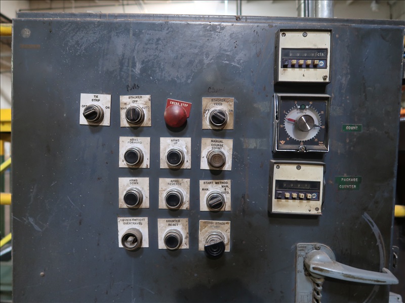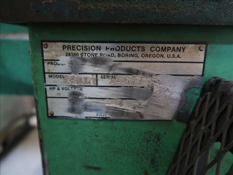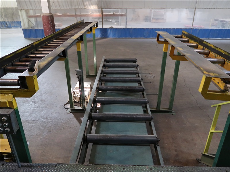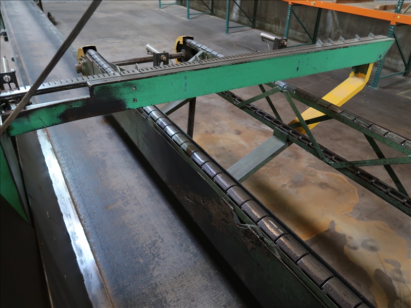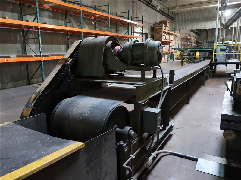 CHOP SAW LINE W/(2) PRECISION 14MLH CHOP SAWS W/7-1/2 HP/3,500 RPM MOTORS, INFEED GRAVITY ROLLCASES, OUTFEED LUMBER GAUGES W/PNEUMATIC KICKERS, GLOBE 3'X18' DOUBLE SCISSOR LIFT W/POWERED 44" ROLLS, 19' 2-STRAND H138 OUTFEED TRANSFER & 28"X52' TRANSFER BELT W/DRIVES
