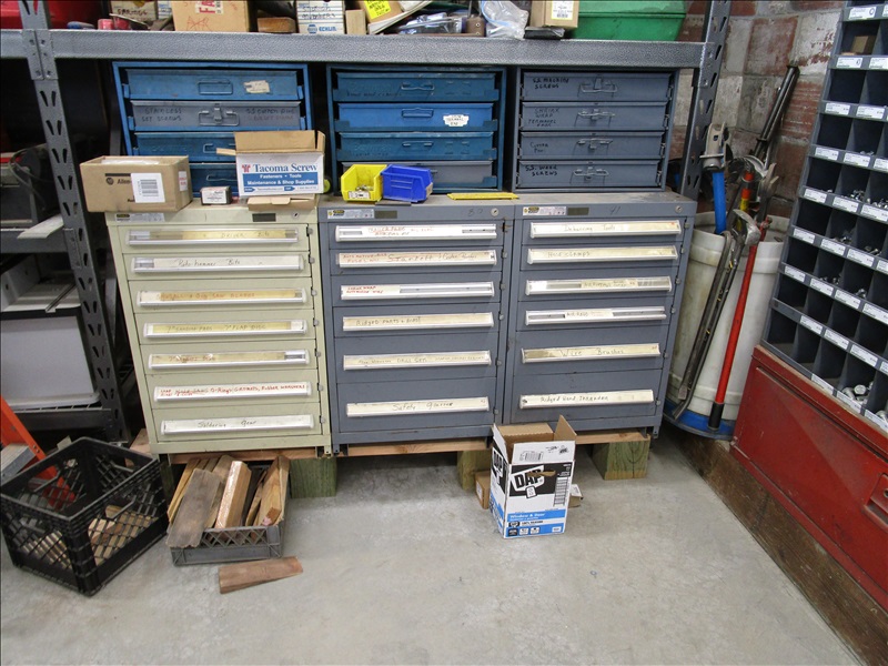 GROUP OF (3) STANLEY VIDMA 6-DRAWER TOOL BOXES W/MISC SUPPLIES