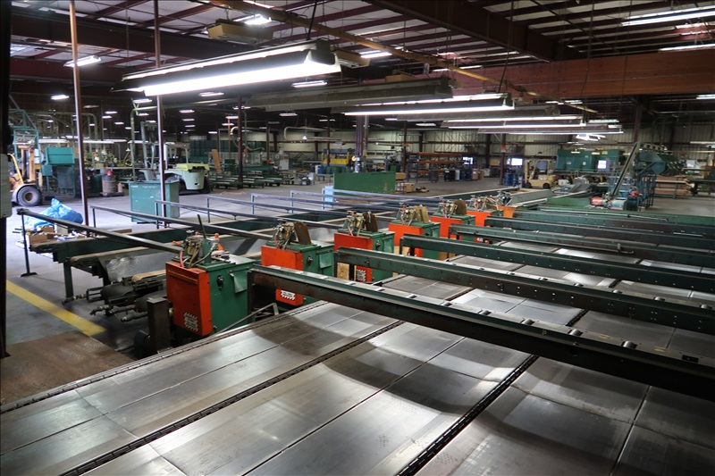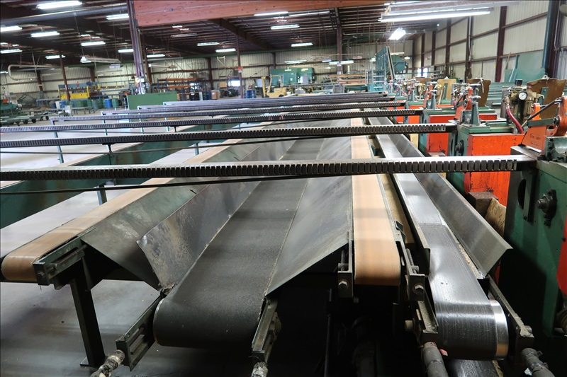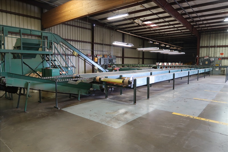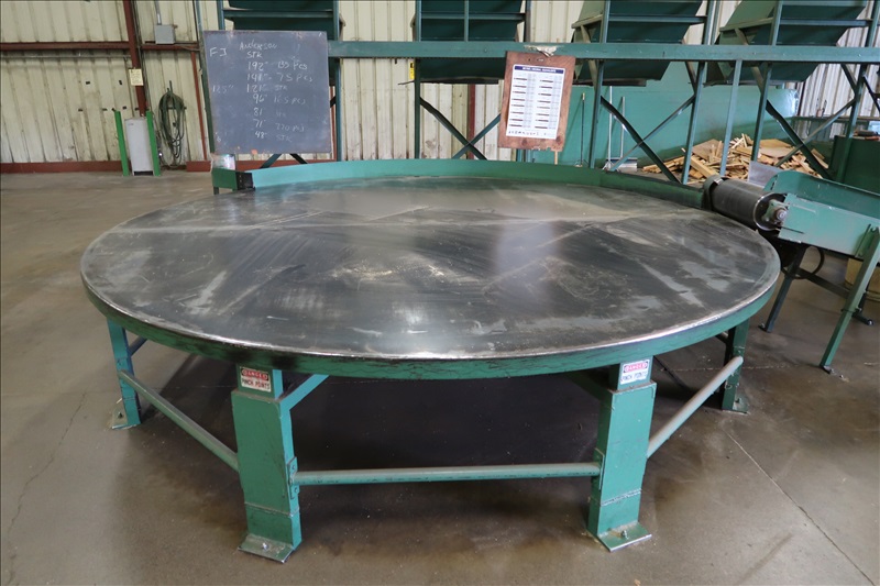 RH CHOP SAWS, APPROX. 5 HP, PNEUMATIC JUMP CUT, 16' INFEED GRAVITY ROLLS, 16' LUMBER GAUGE OUTFEEDS, 45' 4-STRAND C55D INFEED TRANSFER, APPROX. 65' 3-STRAND X 7" BELT TRANSFER W/18", 12" & 8" TRANSFER BELTS, 12' DIA. ROUND TABLE