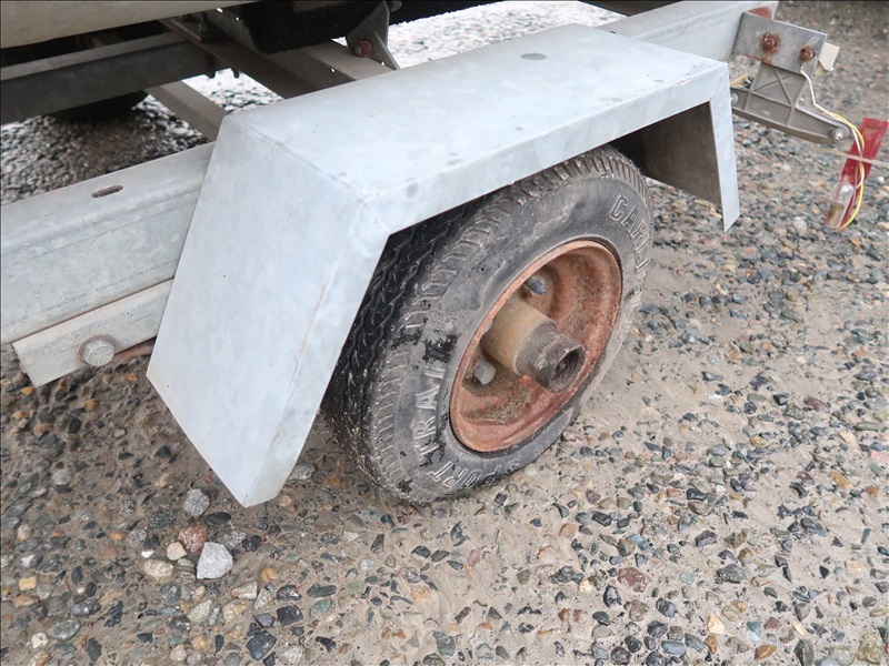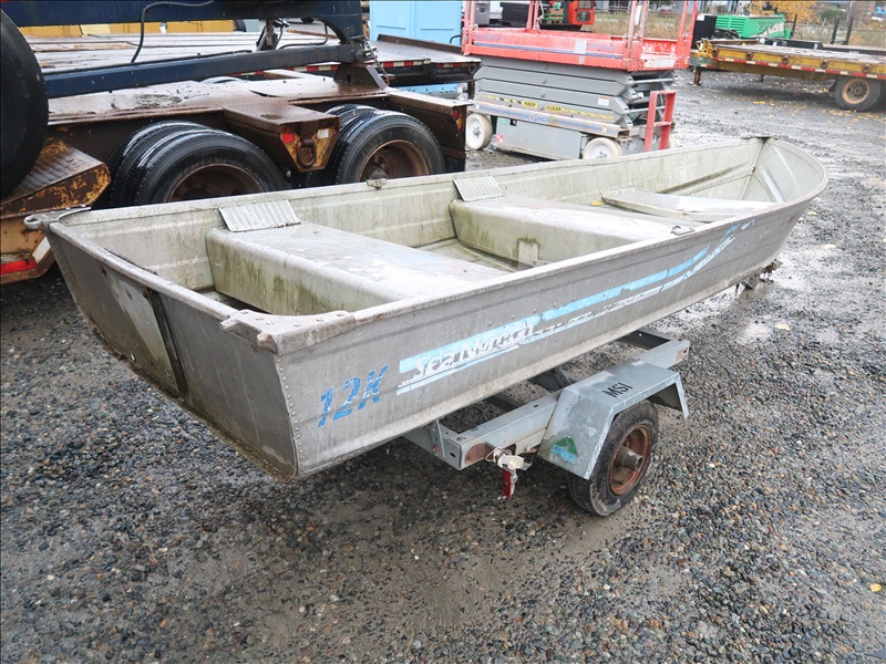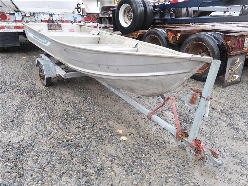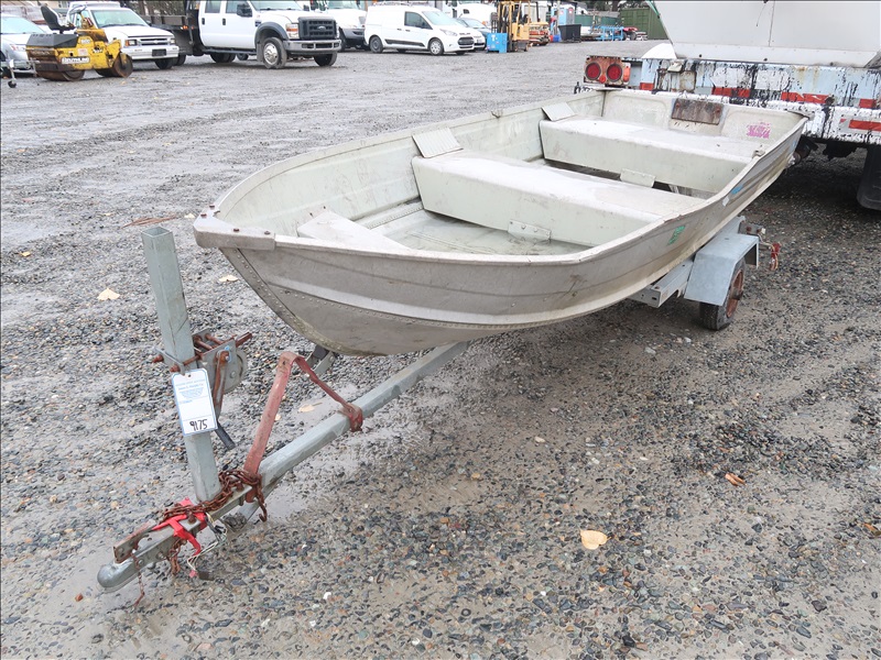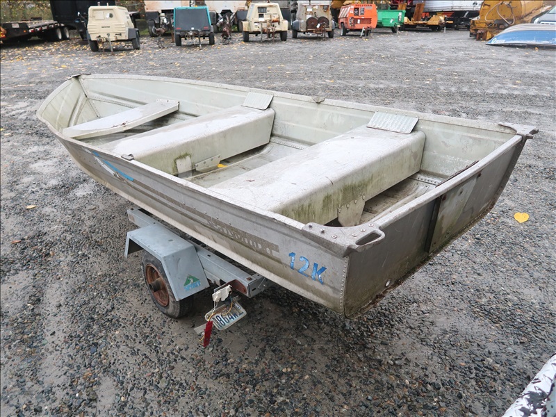 12' ALUMINUM BOAT (NEEDS REPAIR) W/SPIRIT MINI 12' GALVANIZED BOAT TRAILER (NEEDS REPAIR, NOT ROAD WORTHY, PLEASE PREVIEW)