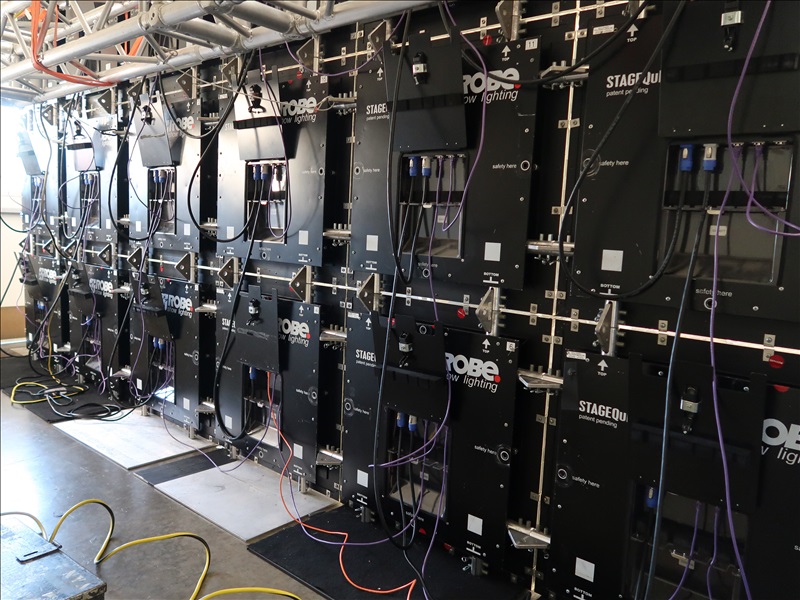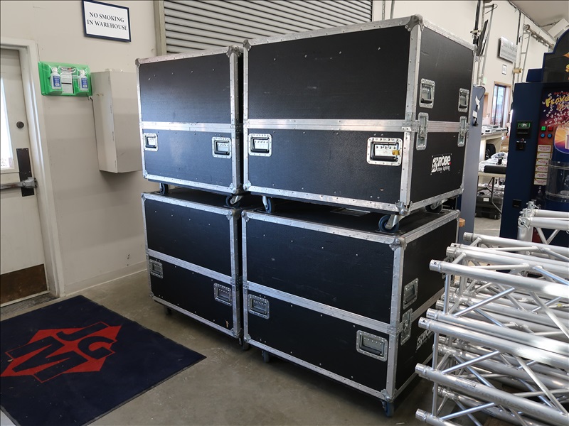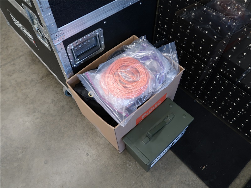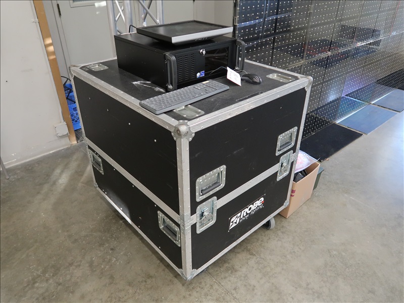 VIDEO PANELS (18 X 18 PX, 110 - 240V, 50/60HZ), ROBE STAGEQUBE CONTROL 4U RACK SERVER W/ (MONITOR, PERIPHERALS, AND CORDS), (6) 2'X2' STEEL BASE PLATES, (5) ROBE STACKABLE ROAD CASES W/CASTERS, (20+) CAT5 ETHERNET PATCH CABLES, (20) 10/3 POWERCON 5' JUMPER A/B CABLES, (3) 10/3 POWERCON 5' IEC CABLES, (80+) LOCKING BRACKETS W/ PINS AND RETAINER CLIPS W/CASE + MISC TOOLS, 35FT VGA CABLE, ANTI GLARE MESH TARP 10'X12'