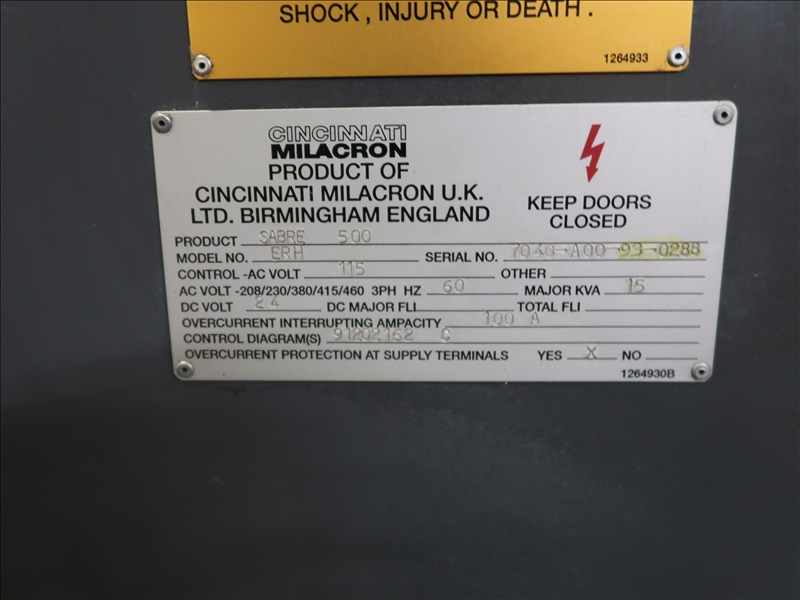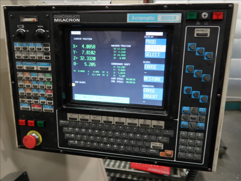 CNC VERTICAL MACHINING CENTER, 16" X 35" TABLE, CINCINNATI NC-10-B 4TH AXIS, JORGENSON 10" CHIP FEEDER, 21 ATC, CINCINNATI ACRAMATIC 850SX CONTROLS, 115V, 3-PHASE, 60HZ