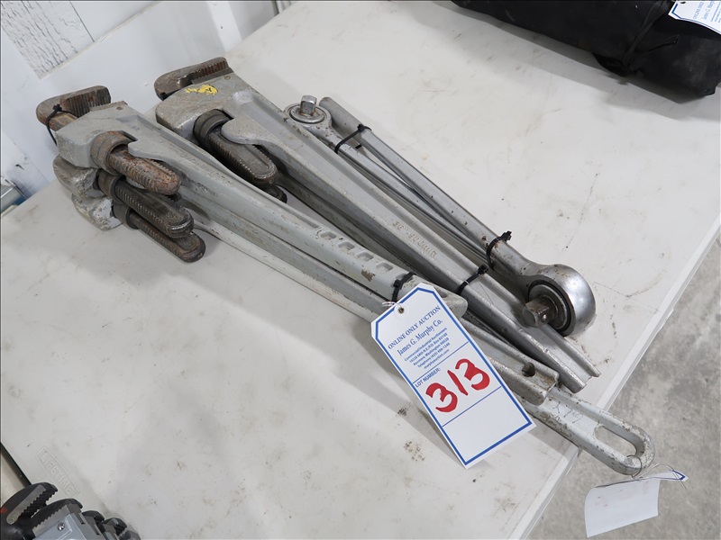 LOT, (5) ASSORTED PIPE WRENCHES & (2) 3/4" RATCHETS