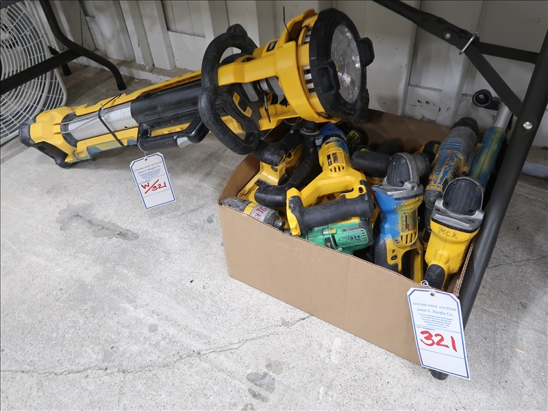 LOT, ASSORTED DEWALT HAND TOOLS UNDER THIS TABLE SECTION TO INCLUDE: (3) BANDSAWS, (2) ROTOHAMMERS, (2) ANGLE GRINDERS, (1) IMPACT, (1) DRILL, (1) SHEAR & (1) WORK LIGHT (NEEDS REPAIR)