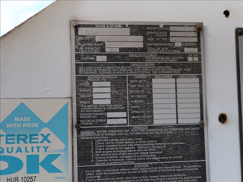 BUCKET TRUCK, DIESEL AUTO, TEREX TELELECT TL38P, HYDRAULIC, 300 LB CAP, 38' BUCKET, PURE SINE INVERTER, 6-DOOR FIBERGLASS S/B W/(2) CRAFTSMAN 5-DRAWER BOTTOM BOX, PTO