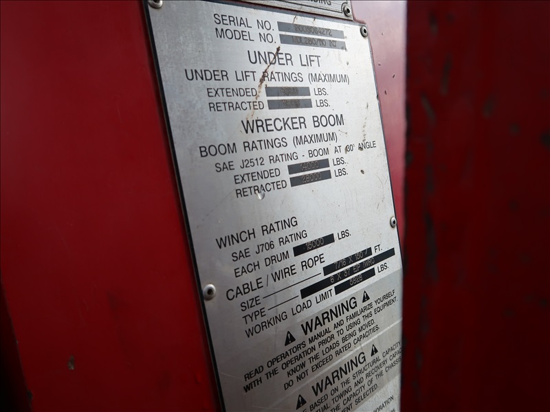 S/A TWIN LINE WRECKER TRUCK, PACCAR PX8, ALLISON 3000RDS-P AUTO, DANA SPICER S23-170 REAR W/5.38 RATIO, 10,000 LB FRONT, JERR DAN MDL280/110INT 14,000 - 28,000 LB BOOM, 8,500 - 11,000 LB UNDER LIFT, (2) 15,000 LB WINCHES, DBL FRAME, LOCKING DIFF, ENGINE BRAKE, 33,000 GVW