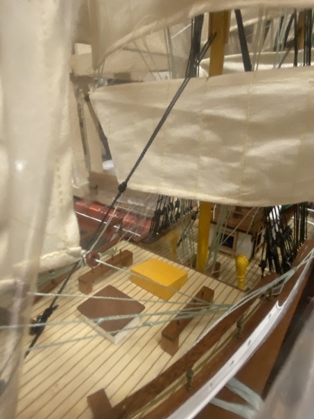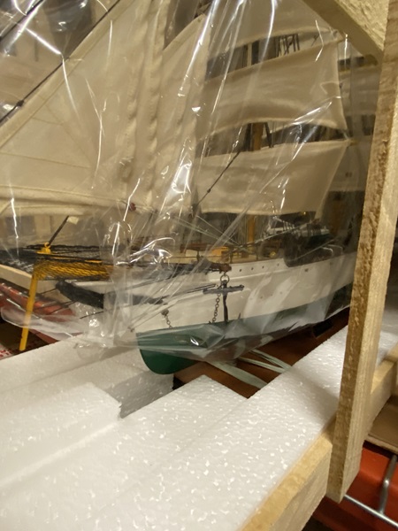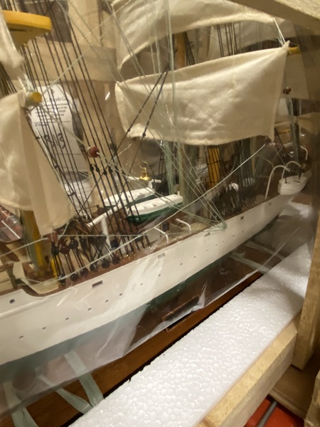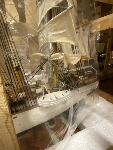 Danmark Tall Ship Model in wooden crate Dimension approximate: 34" (long) x 10" (wide) x 25" (high). The model is already built, NOT a model ship kit