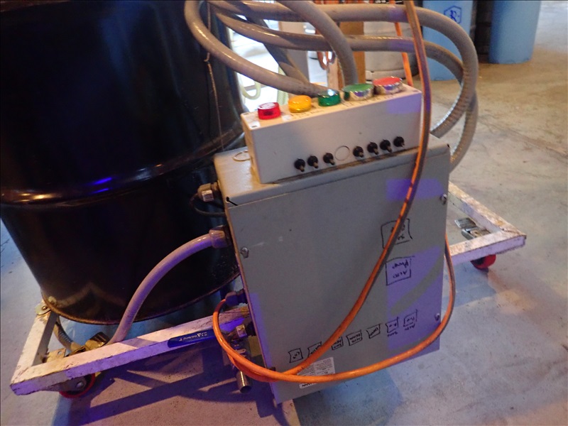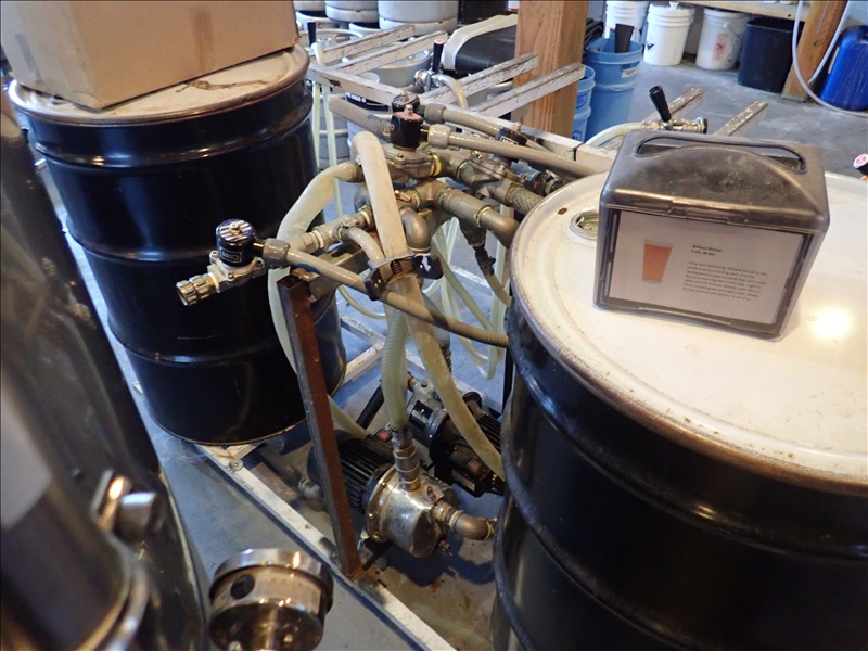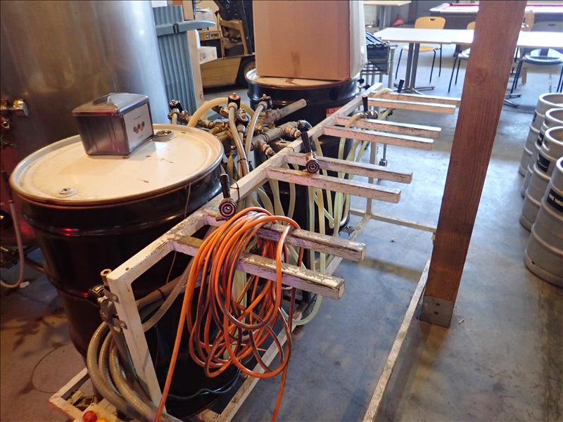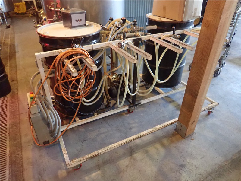 CUSTOM BUILT 4-HEAD KEG WASH W/(2) 55 GALLON DRUMS, (2) PUMPS & CONTROLS (ONE PUMP MAY NEED WORK)