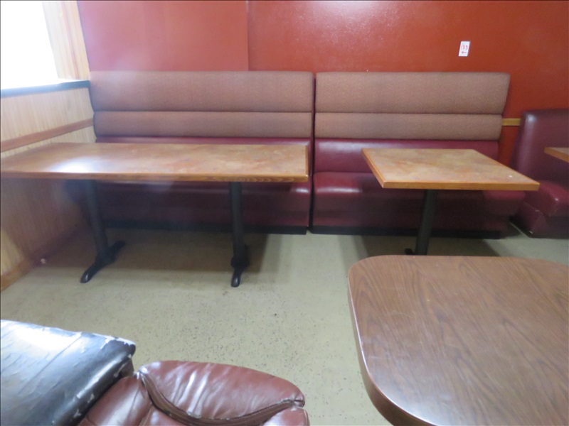 LOT, DINING SECTION TO INCLUDE: (1) 72" X 30" DOUBLE PEDESTAL DINING TABLE, (1) 30" X 30" SINGLE PEDESTAL DINING TABLE & (1) 6' X 5' SINGLE SIDED BOOTH SEAT