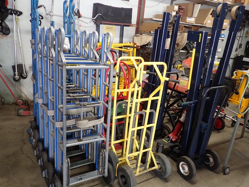 (6) MOVING DOLLIES, (5) HAND TRUCKS, ENGINE HOISTS, TILE SAW, BILLY GOAT HIGH GRASS MOWER