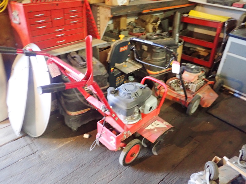 ROTOTILLER, MOWER , SHOP VACS, BAND SAW, CARTS, CABINETS
