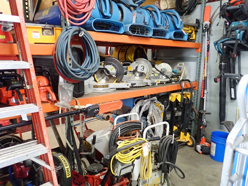 (4) AIR MOVERS, (2) TABLE & (3) MITER SAWS, FLOOR STRIPPERS, TEXTURE & PAINT SPRAYERS