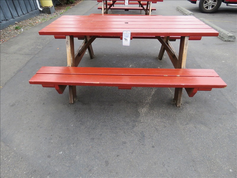 WOOD PICNIC TABLE (TABLE IS ANCHORED TO GROUND, $100 REFUNDABLE DEPOSIT IS REQUIRED TO ENSURE BUYER GRINDS BOLTS FLUSH W/CONCRETE)