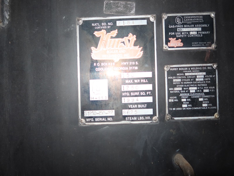 GAS FIRED STEAM BOILER, 150 MAX WP, 8625 STEAM LBS PER HOURS, S/N: S1250-150-22
