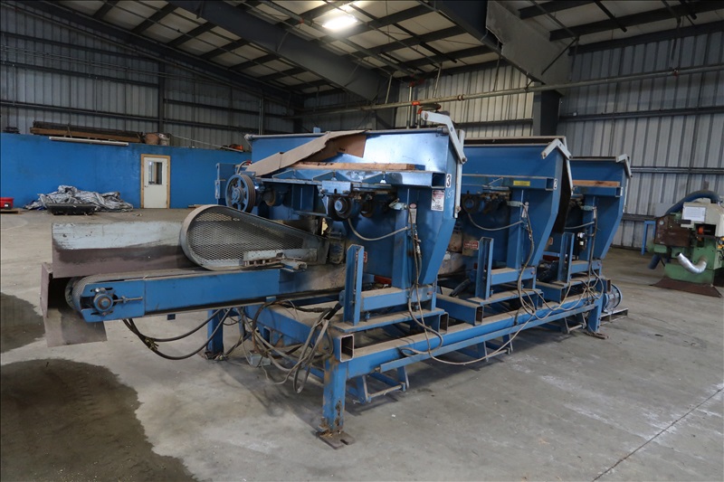 36" 3-HEAD RESAW SYSTEM W/6" HYDRAULIC DRIVEN FEED THRU BELT & HOLD DOWNS, HYDRAULIC TENSIONING ON EACH SAW, ATTACHED ELECTRICS (NO DRIVE MOTORS ON SAWS)