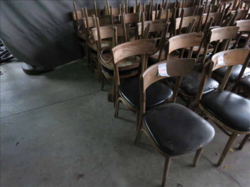 LOT, (8) WOOD FRAMED PADDED PATIO CHAIRS (SOME NEED REPAIR)