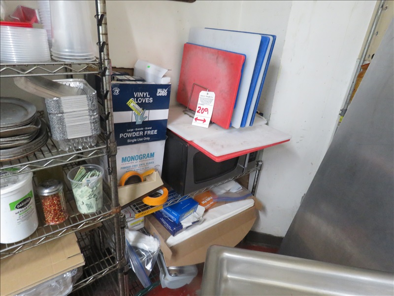 LOT, ASSORTED RESTAURANT SUPPLIES ON THIS RACK (DOES NOT INCLUDE RACK OR MICROWAVE)