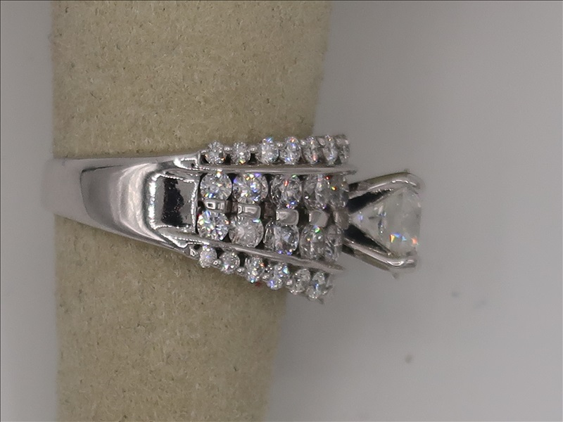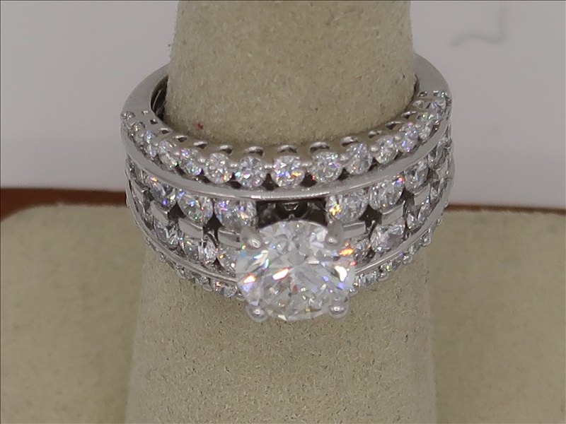 LADIES 14K WHITE GOLD RING, ROUND BRILLIANT DIAMOND, WEIGHING APPROX 1.54 CT, SETTING W/MULTIPLE DIAMONDS, SIZE - 5 3/4 ( W/ DOCUMENTATION )