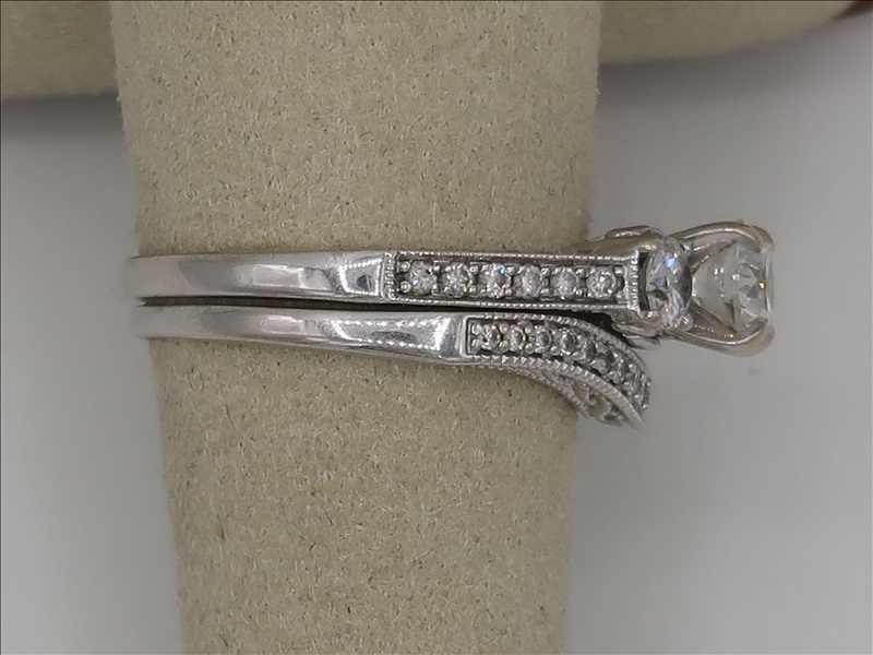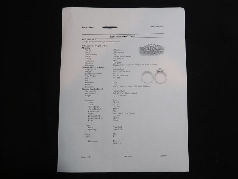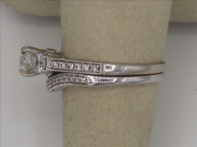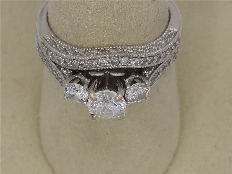 LADIES 2 PIECE 14K WHITE GOLD WEDDING SET, ROUND BRILLIANT DIAMOND WEIGHING APPROX .72 CT, SETTING W/ MULTIPLE DIAMONDS, APPROX 1.03 CTS, ESTIMATED TOTAL DIAMOND WEIGHT APPROX 1.75 CTS, SIZE - 8 (W/ DOCUMENTATION )