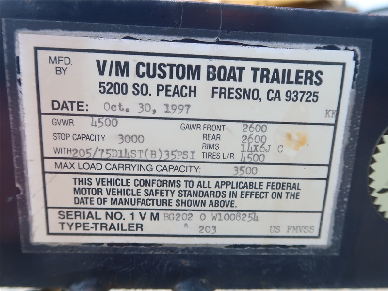 20' I/O OPEN BOW RUNABOUT BOAT, VOLVO PENTA 5.0L V8, VOLVO PENTA SX COBRA OUTDRIVE, PIONEER STEREO, BIMINI TOP W/1998 V/M CUSTOM BOAT TRAILERS T/A 4,500 LB GVWR BOAT TRAILER S/N: 1VMBG2020W1008254