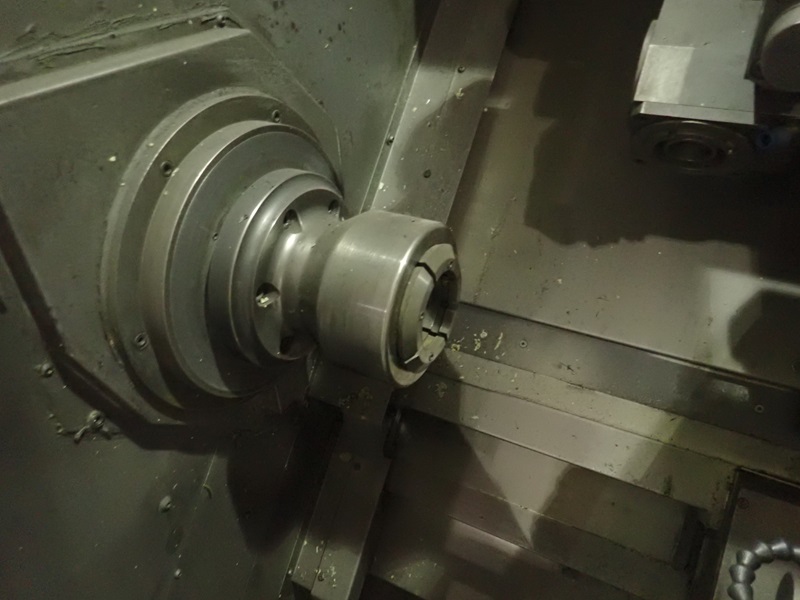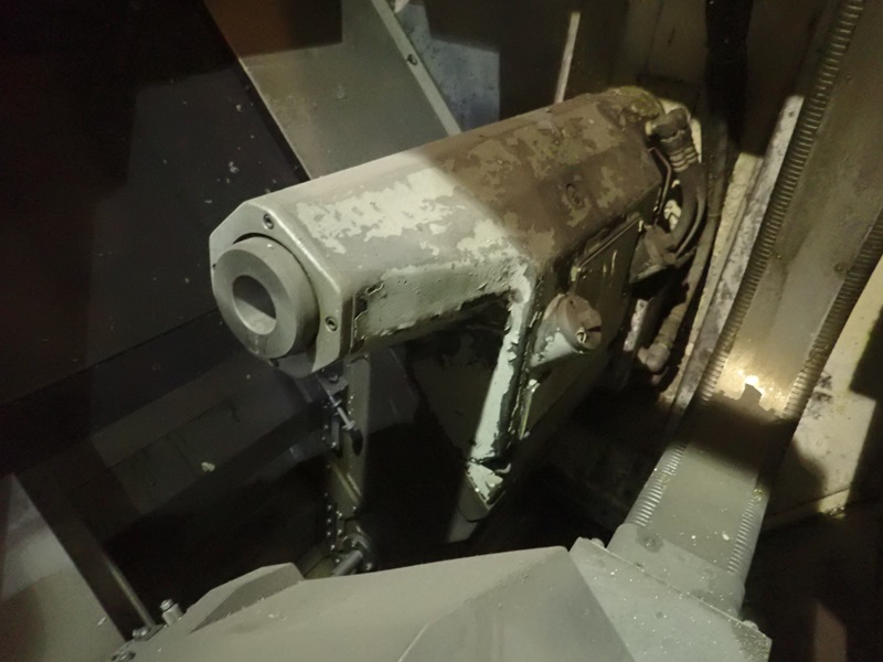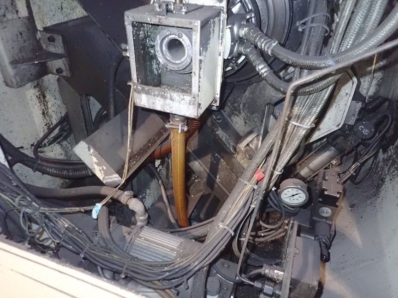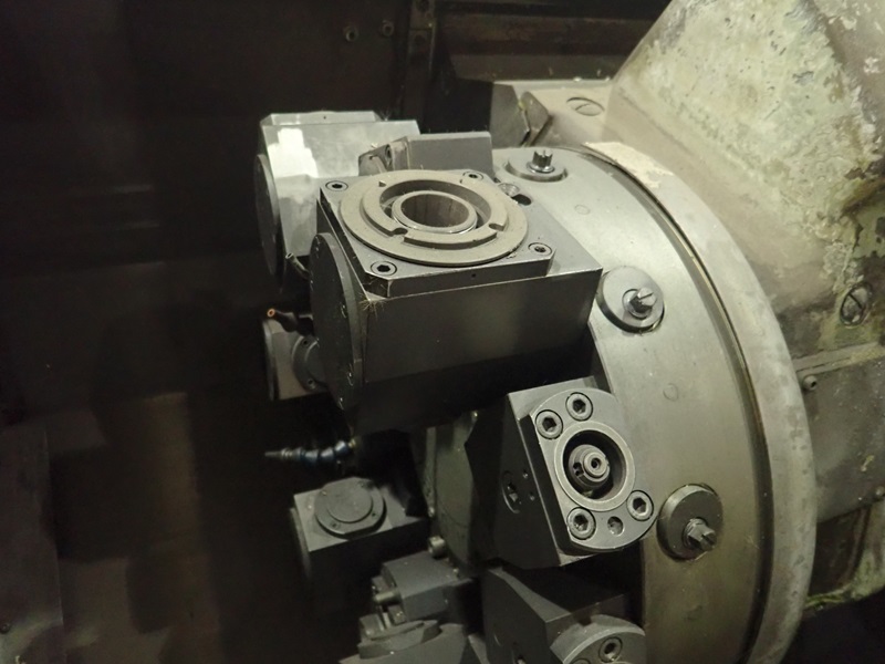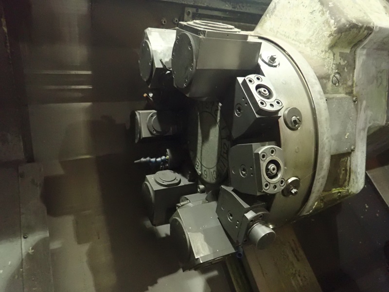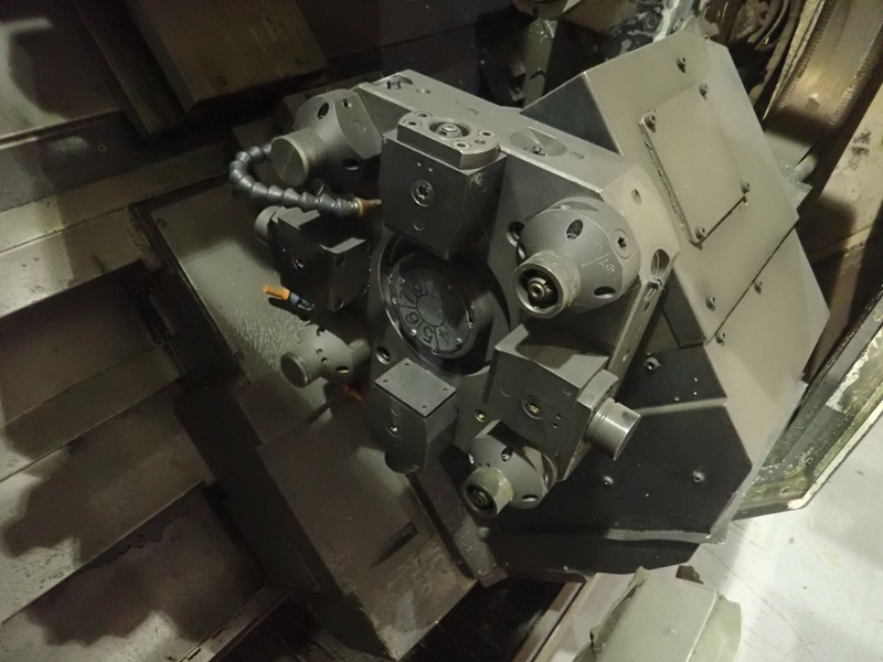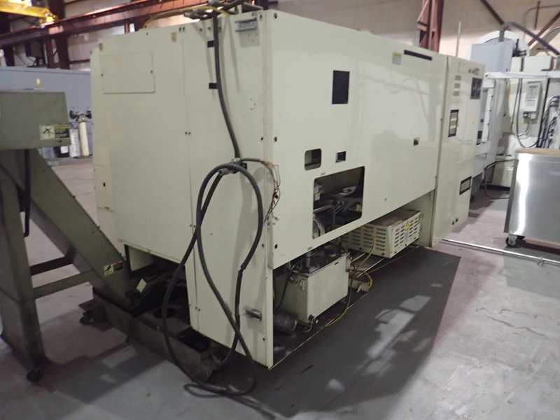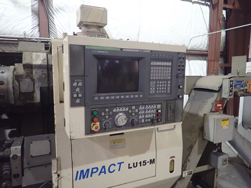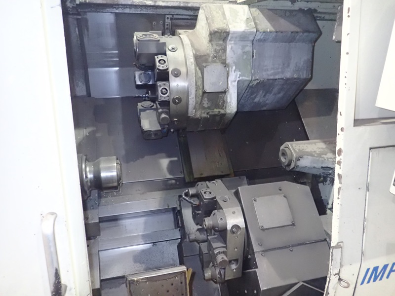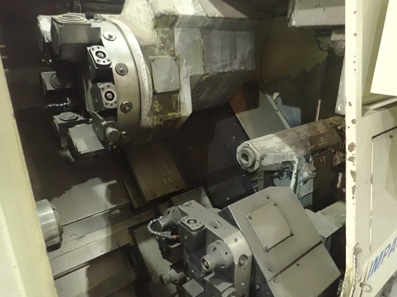 IMPACT CNC TURNING CENTER, 12 & 8-STATION TURRETS, TAIL STOCK, THRU-SPINDLE, OSP7000L CONTROLS, JORGENSEN CHIP CONVEYOR